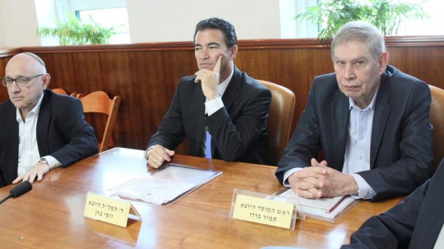 Acting National Security Adviser Yaakov Negel (L), Mossad Director Yossi Cohen (C) and former Mossad director Tamir Pardo (L) attend a cabinet meeting at the Prime Minister’s Office in Jerusalem on January 10, 2016 (Alex Kolomoisky/Pool)