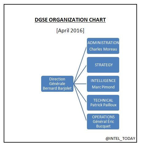 Besides the General-Directorate headed by Bernard Bajolet — since April 2013 — the DGSE includes the following 5 Directorates. [Note: Bajolet is expected to retire on May 21 2017.]