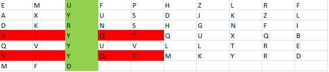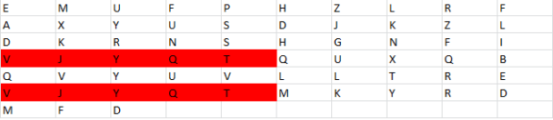 If a human being can break the first section of this KRYPTOS code, the obvious thing to notice — once you have detected the 10 letters pattern — is that the third column has FOUR identical letters.