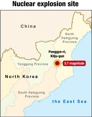 South Korea Joint Chiefs of Staff (JCS) said it detected a 5.7-magnitude earthquake around 12:39 p.m. at North Korea’ nuclear test site in Punggye-ri, Kilju-gun, North Hamgyong Province. It said the earthquake was artificial. The Korea Meteorological Administration (KMA) also detected the artificial seismic event.