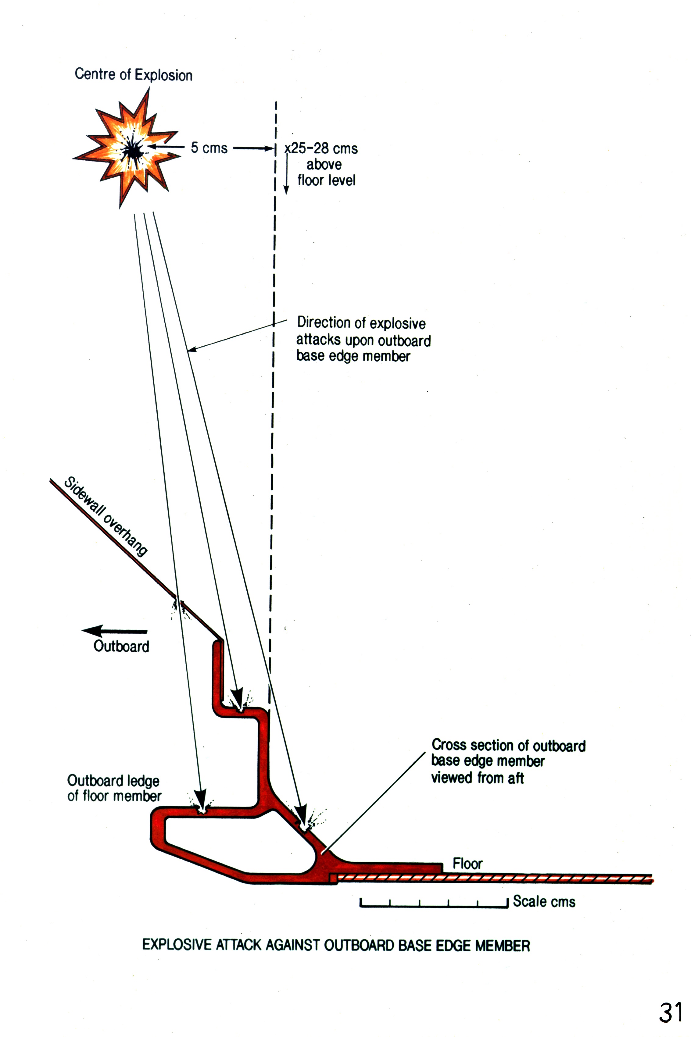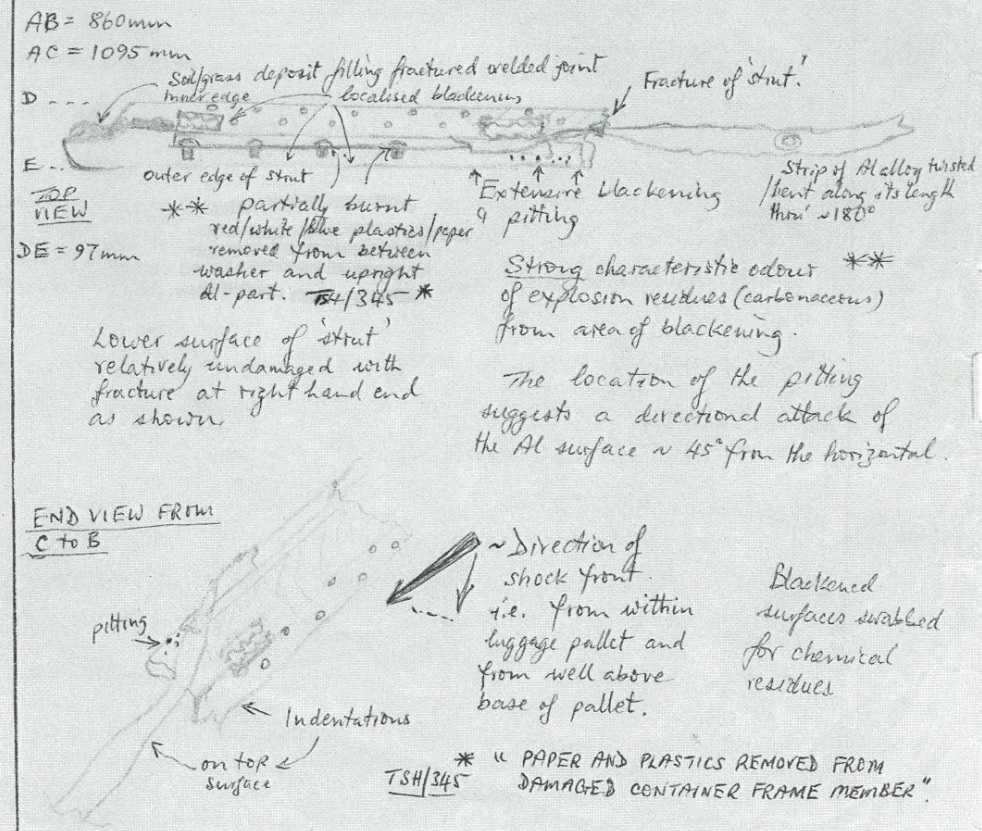 On the very first page of his forensic notes (December 27 1988), Dr Hayes concluded from the location of the “pitting” that the locus of the explosion was well above and on the “right side” of the outboard pallet frame. (He estimated the angle was about 45°.)