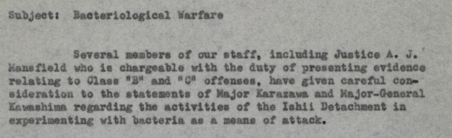 In a controversial decision by the chief prosecutor for the IMTFE, Frank Tavenner, no evidence on biological warfare charges was allowed in the postwar war crimes trials. Supposedly this was because prosecutors could not link the germ warfare crimes to anyone who was specifically on trial. But in actuality, the U.S. had made a secret agreement with Japan’s biological warfare experts not to prosecute them if they gave all their data and expertise to U.S. biological warfare and intelligence departments.