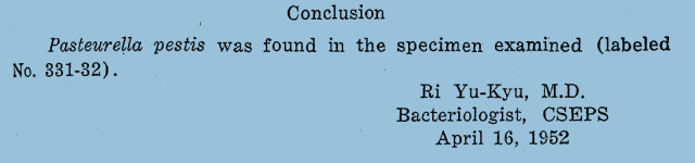 ISC investigators recounted his testimony: “The whole picture in the case of this peasant-farmer was identical not only with that of those where the Japanese disseminated fleas infected with Pasteurella pestis between 1940 and 1944, but also with that of several other places in the northern part of Korea in 1952 where plague fleas suddenly appeared in large numbers after the passage of American planes…. The phenomena of 1952 were, in his opinion, on a considerably larger scale than anything which the Japanese had ever attempted.”
