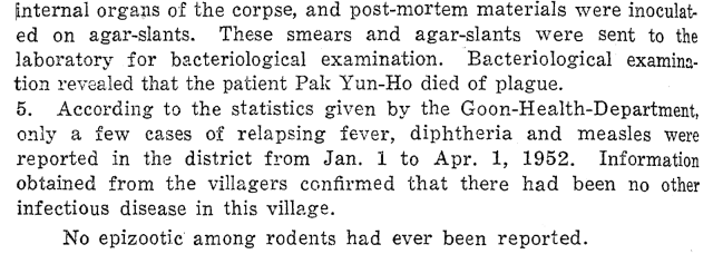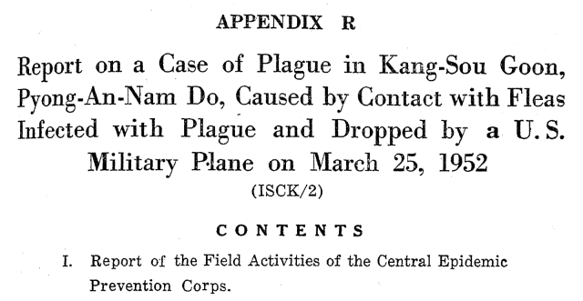 “Since the beginning of 1952 numerous isolated foci of plague have appeared in North Korea, always associated with the sudden appearance of numbers of fleas and with the previous passage of American planes.