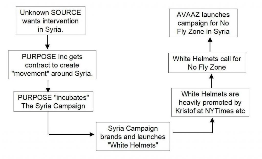 The PR network is made up of Avaaz, Purpose, Syria Campaign and the White Helmets and is detailed by Cory Morningstar and Rick Sterling in their respective articles.” ( )