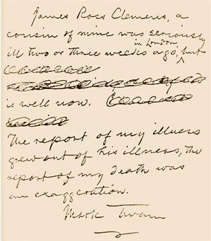 “I can understand perfectly how the report of my illness got about, I have even heard on good authority that I was dead. James Ross Clemens, a cousin of mine, was seriously ill two or three weeks ago in London, but is well now. The report of my illness grew out of his illness. The report of my death was an exaggeration.”