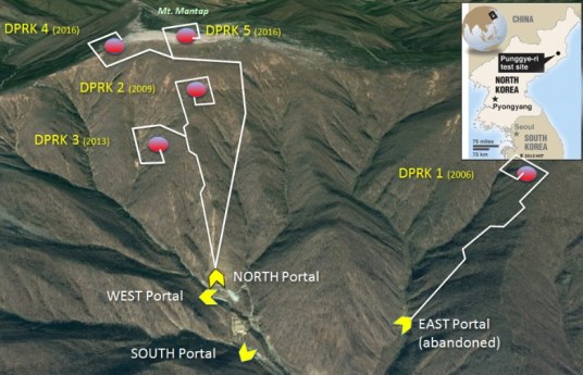 The North Portal tunnels provide direct access under Mt. Mantap, where up to 800 meters of overlying rock is available for test containment. This locale provides the maximum overlying rock possible within the entire test site and is where the most recent and largest detected test occurred on September 9, 2016.”