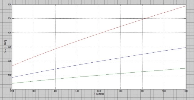 However, considerably larger value would be deduced if the magnitude 6.3 is used and if the depth of the explosion is greater. Some researchers have suggested that h could be 900 meters. In that case, the yield could be as high as 500 kt.