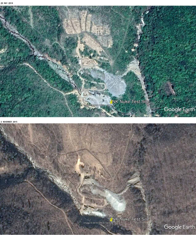 UPDATE ( September 15 2018) — These pics were taken on May 20 2018 and November 2 2015. Clearly, North Korea’s nuclear test site has at least partially collapsed. It is unclear whether the underground infrastructure beneath mountain Mantap can still be used for any future nuclear tests. I doubt it vey much.