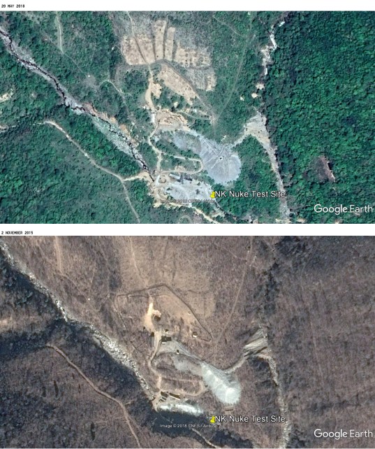 These pics were taken on May 20 2018 and November 2 2015. Clearly, North Korea’s nuclear test site has at least partially collapsed. It is unclear whether the underground infrastructure beneath mountain Mantap can still be used for any future nuclear tests.