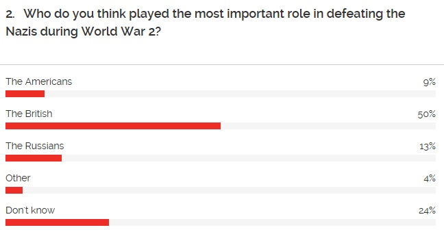 Fifty percent of the UK adults appear to believe that their country played the most important role in defeating the Nazis. That is right: 50%!