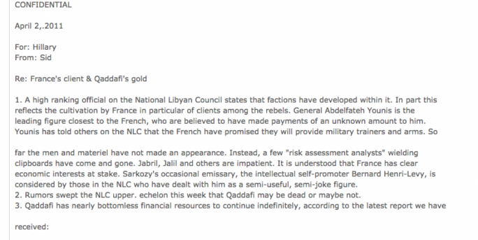 The email from 2011 was released by WikiLeaks, a whistle-blower website, in 2015. The email on the subject of France’s interest in Libya made reference to a General Abdelfateh Younis.