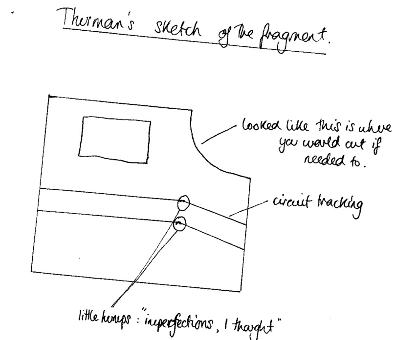 “Special photography techniques were utilized on specimen K-1 to identify the number/letter “21B” which is contained within the figure of an oval. The number/letter appears in the upper left quadrant of the circuit board, within the lamination and not on the surface of the board. This identification was added during the manufacturing process, and may offer a code to identify the source of this board. It should be noted, however, that the company which applied the actual printed circuit, may not be the company which manufactured the green circuit board.”