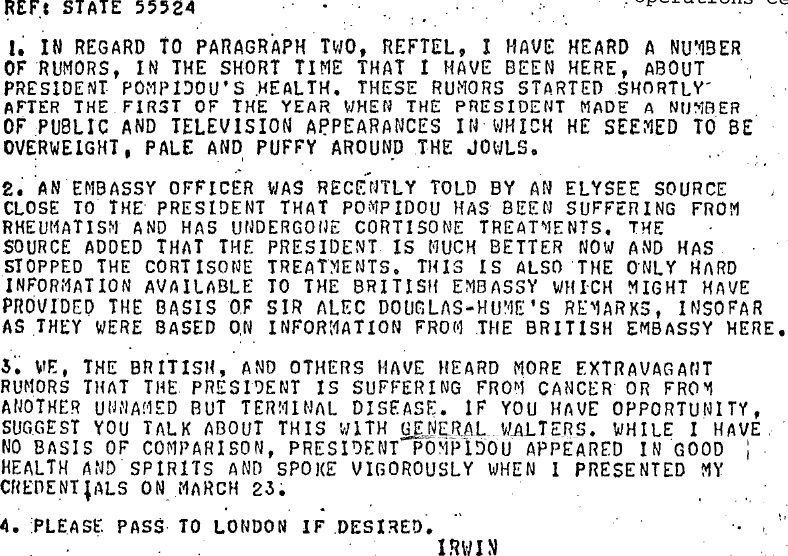 For instance, here is a cable — dated March 28 1973 — from the US Embassy in Paris regarding the health of the French President. Pompidou died on April 2 1974, from Waldenström’s macroglobulinemia (a type of cancer).