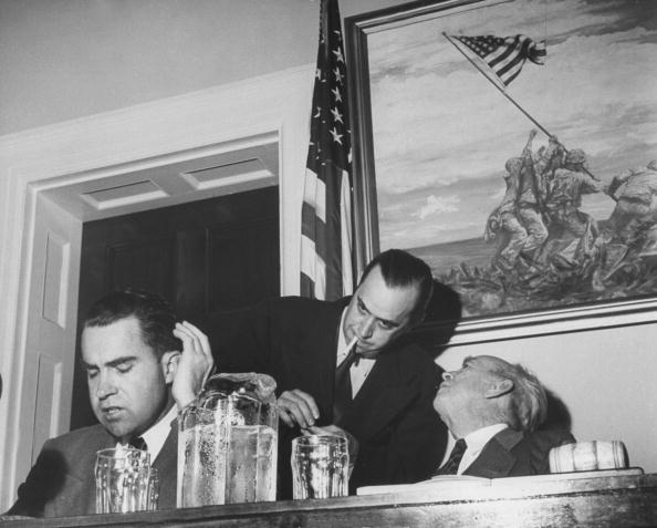 Richard M. Nixon (L) speaking at the testimony in which Whittaker Chambers accuses Alger Hiss of securing important U. S. documents which were turned over to a Russian agent. (Photo by James Whitmore/The LIFE Images Collection/Getty Images)