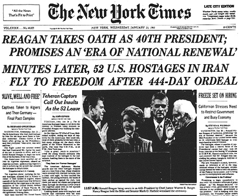 On January 20 1981, 20 minutes after Reagan concluded his inaugural address, the Islamic Republic of Iran announced the release of the release of 52 Americans being held hostage in Iran since November 4 1979. Allegations that the Reagan administration negotiated a delay in the release of the hostages until after the 1980 presidential election have been numerous. Gary Sick, principal White House aide for Iran and the Persian Gulf on the Carter administration’s National Security Council, claimed in his book “October Surprise: America’s Hostages in Iran and the Election of Ronald Reagan” that CIA Director William Casey and possibly Vice President George H. W. Bush went to Paris to negotiate such a delay. Follow us on Twitter: @INTEL_TODAY