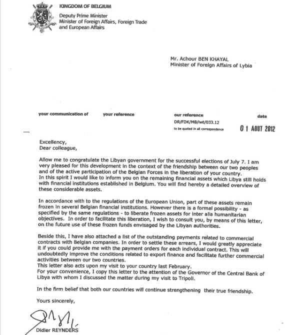 But a letter dated August 1st 2012 indicates clearly that Reynders was involved in an attempt to unfreeze the funds.