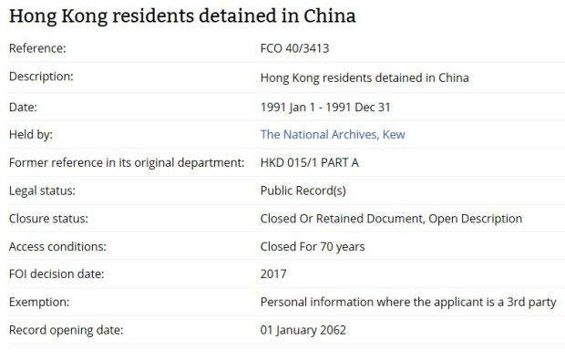 According to the information posted on the website of the UK National Archives, this file — Hong Kong residents detained in China | The National Archives — was classified in 1992 for a period of 70 years!
