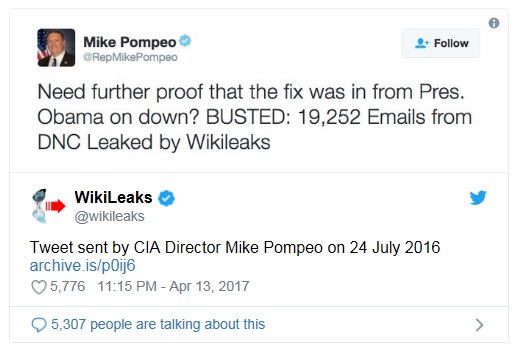 In July 2016, after he spotted an article on the conservative website RedState about WikiLeaks publishing more than 19,000 emails stolen from the Democratic National Committee, Mike Pompeo retweeted the story, adding, “Need further proof that the fix [for Hillary Clinton’s nomination] was in from Pres. Obama on down?”