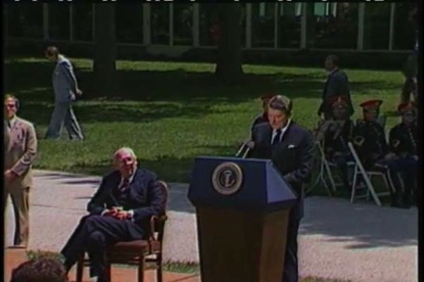 June 23 1982 — President Reagan tells a good Irish joke before signing the IIPA at the CIA Headquarters