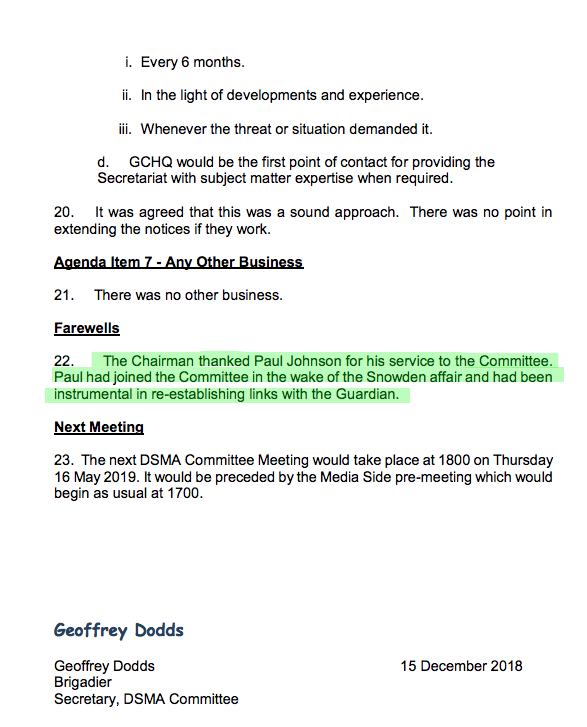 “The Chairman thanked Paul Johnson for his service to the Committee. Paul had joined the Committee in the wake of the Snowden affair and had been instrumental in re-establishing links with the Guardian.”