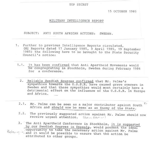 “The Anti Apartheid Conference in Stockholm, it is suggested by our Swedish Sources in Uppsala, would present the ideal opportunity to take the necessary action against Mr. Palme and it would be possible to ensure that the action be attributed to other groups.”