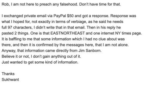 The person who brought the new clue to the group, Sukhwant Singh, was adamant in the face of frank disbelief that Sanborn simply put another clue out there. He used the payment system Sanborn set up to winnow the number of inquiries he gets, and EAST was part of Sanborn’s reply.
