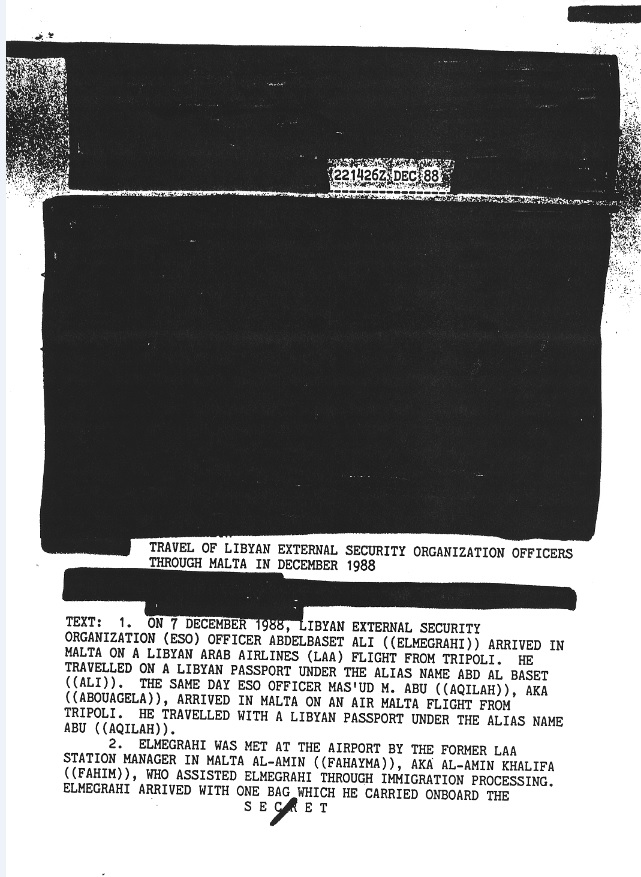 Comment — This cable has just one error. MEGRAHI and MASUD were scheduled to depart for Zurich on December 8 1988, but they actually left MALTA on December 9 due to a flight delay.