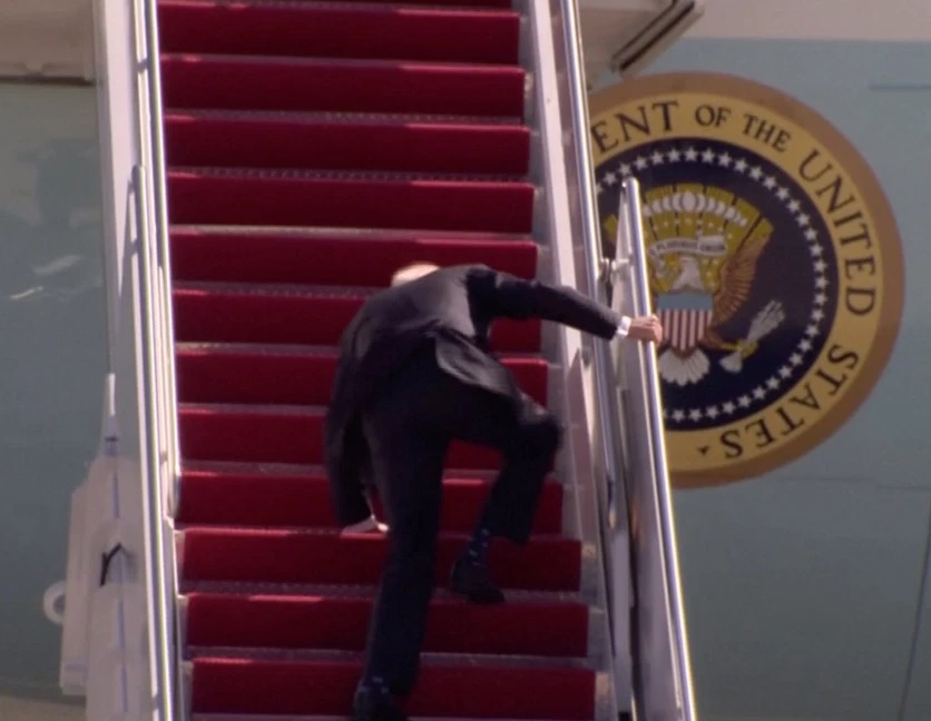About halfway up the red carpeted stairs, Biden could be seen losing his footing before stumbling three times.