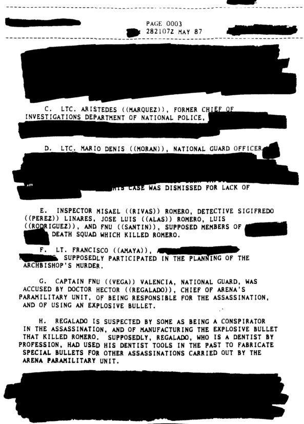 In May 1987, the CIA wrote a cable listing the various suspects of this crime. The cable states that, although there is no hard evidence, the allegations against D’Aubuisson are credible.