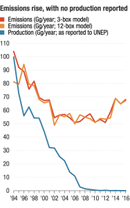 “A simple model analysis of our findings suggests an increase in CFC-11 emissions of 13 ± 5 giga-grams per year (25 ± 13 per cent) since 2012, despite reported production being close to zero since 2006. “