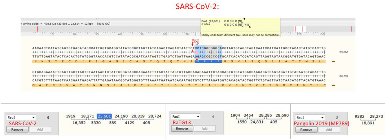 The polybasic furin site in SARS-CoV-2 was created by a 12-nucleotide insert TCCTCGGCGGGC coding for a PRRA amino acid sequence at the S1/S2 junction (Figure 1). Interestingly, the two joint arginines are coded by two CGGCGG codons, which are rare for these viruses: only 5% of arginines are coded by CGG in SARS-CoV-2 or RaTG13, and CGGCGG in the new insert is the only doubled instance of this codon in SARS-CoV-2.