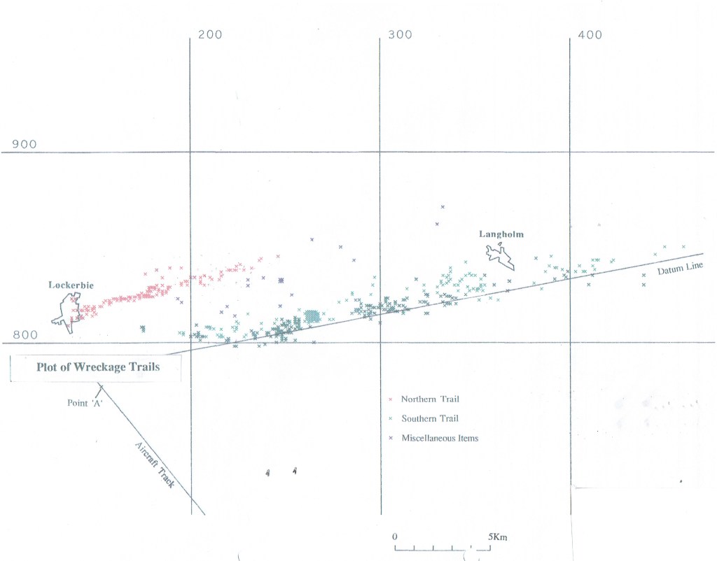 The northern trail was created by debris released from the back of the aircraft in a vertical dive between 19,00 and 9,000 feet overhead Lockerbie.