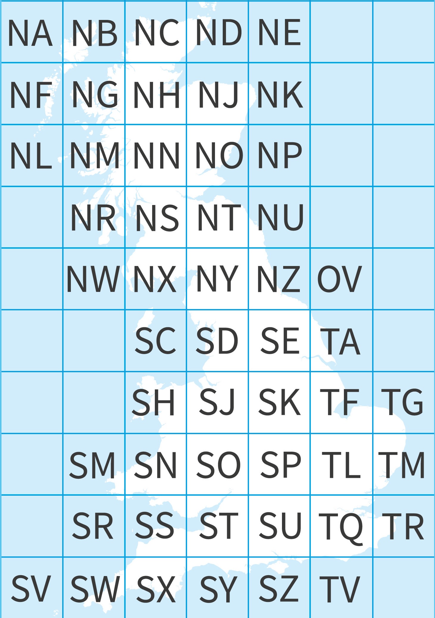 Great Britain is covered by grid squares measuring 100 kilometres across and each grid square is identified by two letters, as shown in this diagram.