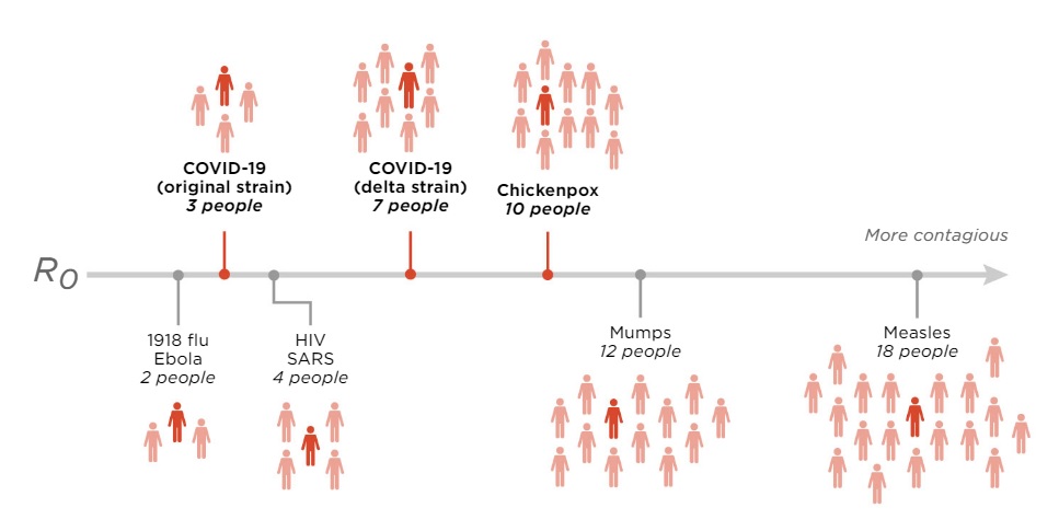 A few months later, the delta variant emerged, most likely in India. For the delta variant, the R0 is now calculated at between six and seven. [NPR — The Delta Variant Isn’t As Contagious As Chickenpox. But It’s Still Highly Contagious]