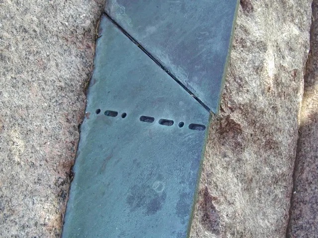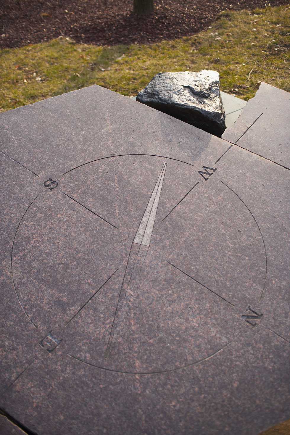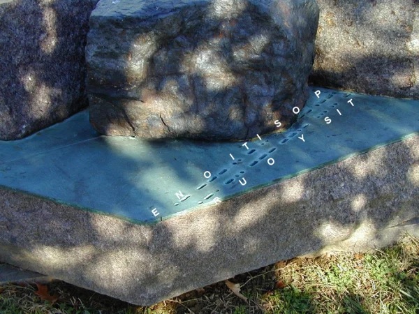 “At the entrance to the New Headquarters building, the sculpture begins with two red granite and copperplate constructions which flank the walkway from the parking deck. These stones appear as pages jutting from the earth with copperplate ‘between the pages’ on which there are International Morse code and ancient ciphers. There is also a lodestone co-located with a navigational compass rose.”