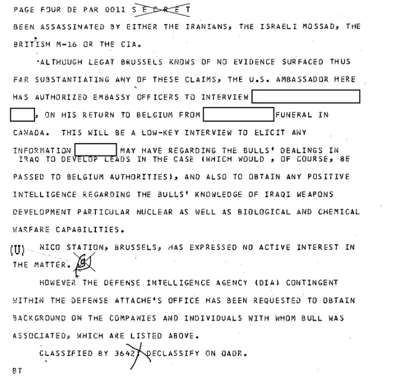 “Who murdered the 62-year-old artillery genius? (…) No one has stepped forward to claim responsibility. However, senior Israeli intelligence officials in several recent interviews with us have claimed responsibility for the slaying. (…) The killing was ordered after Mossad, Israel’s secret foreign-intelligence service, gathered information that Bull was working with Iraq in the production and acquisition of mass destruction weapons for Iraq.”