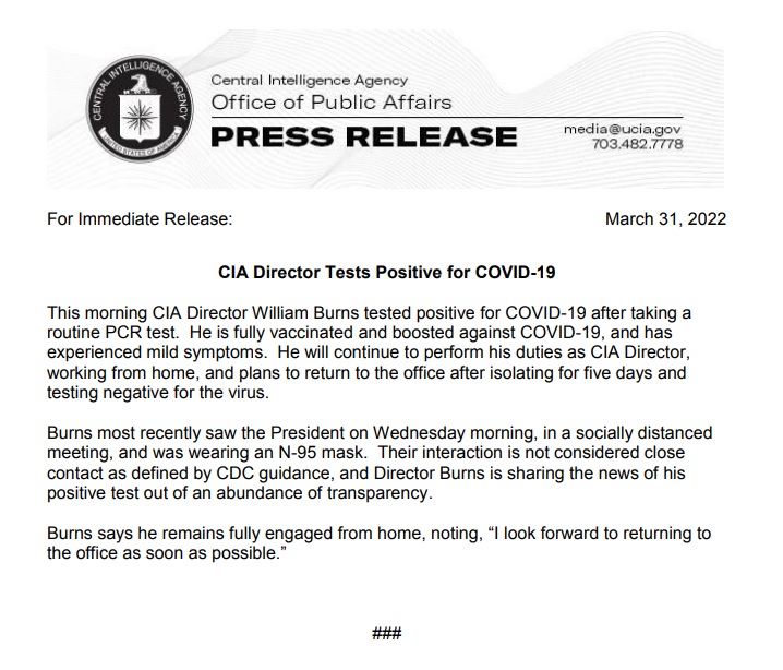 UPDATE (April 2 2022) — CIA Director William Burns has tested positive for Covid-19, the agency announced on Thursday.