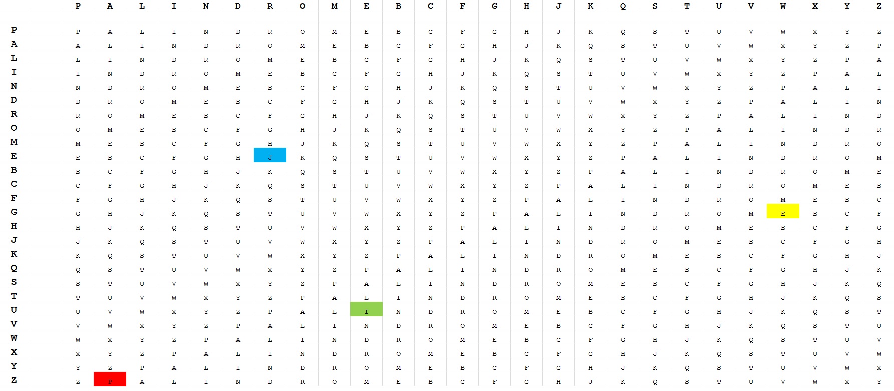 Now, look in the Vigenère table which letter encoded with a Z gives a P? That is A! (in RED)