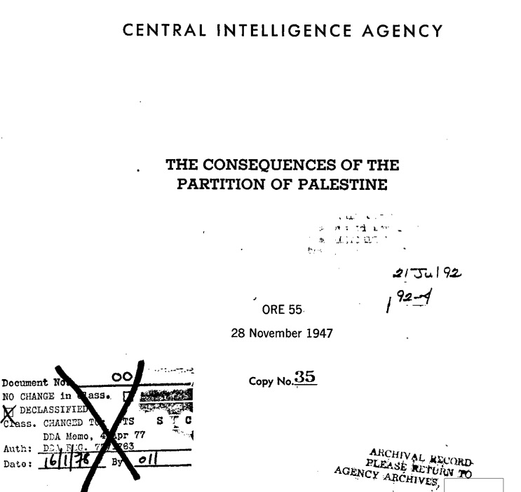 CIA Declassified — THE CONSEQUENCES OF THE PARTITION OF PALESTINE (CIA, November 28 1947)