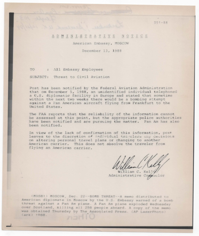 Since the warning was posted on December 14 1988, I would expect that diplomatic personnel in Moscow would have re-booked their flight on December 15 1988.