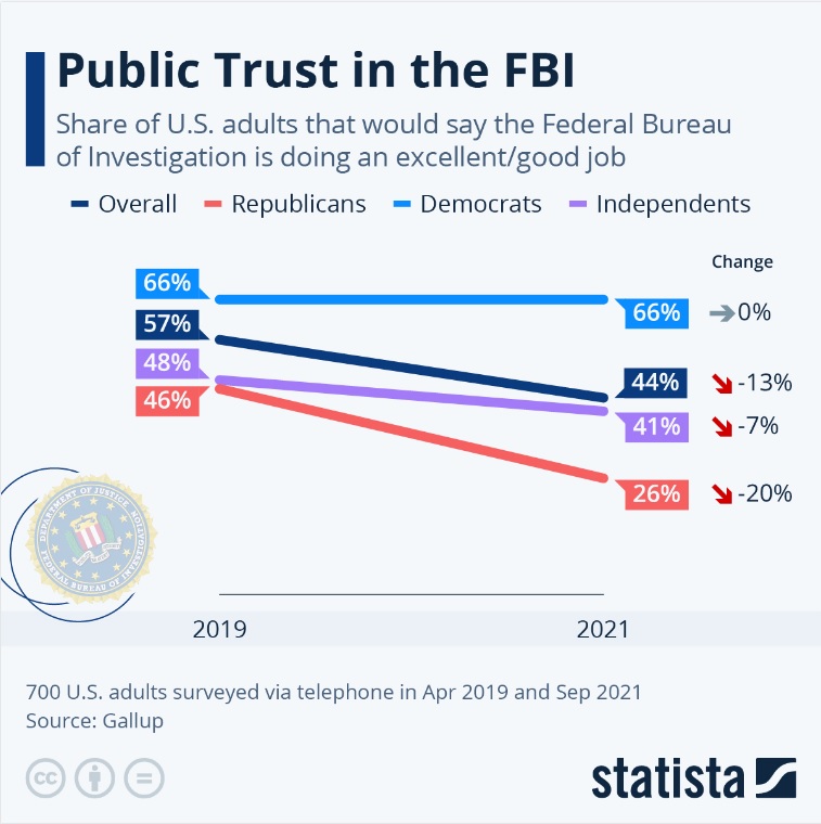 UPDATE (January 15 2024) — Public trust in the FBI has fallen in recent years. Back in 2019, 57 percent of U.S. adults said that the FBI was doing either an “excellent” or a “good” job. In 2021, only 44% had a positive view of the Bureau. [Statista]