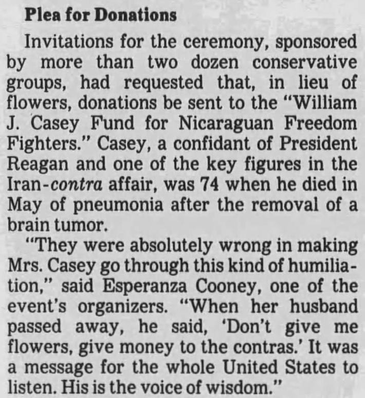 Casey’s family requested mourners to donate to the Contras in Nicaragua instead of bringing flowers to his funeral. That decision reflects the ideological stance and support for anti-communist causes that were associated with Casey during his tenure as CIA director.