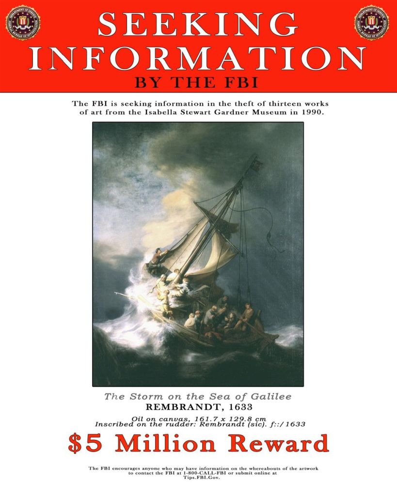 March 18 2024 — On March 18 1990, two men posing as police officers entered the Isabella Stewart Gardner Museum in Boston and stole 13 pieces, including three Rembrandts, among them his only seascape “The Storm on the Sea of Galilee”, Vermeer’s “The Concert”, and works by Flinck, Manet, and Degas. Despite a $10 million reward and promises of immunity, none of the pieces has been recovered. Thirty-four years later, nobody has ever been charged with the crime. In 1990, the FBI estimated the value of the haul at $200 million. This estimate was raised to $500 million by 2000. Today, these pieces could be worth US $1 billion. Follow us on Twitter: @Intel_Today