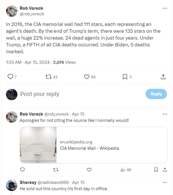 April 18 2024 – Let me say this once again: “You are entitled to your opinion. But you are not entitled to your own facts.” You may dislike Donald Trump, but lying about the CIA memorial Wall does not make you a patriot. How many lies do you count in the short message posted by Rob Voreck? Follow us on Twitter: @INTEL_TODAY