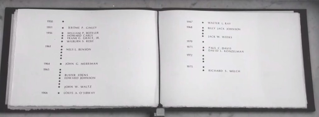Second point: The video features an early version of the wall and the Book of Honor dated 1975, at which point it already had 33 stars. As I previously noted, I have never seen a picture of the original wall with 31 stars, and such pictures may simply not exist.