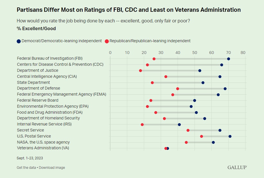 Bottom Line — Americans’ ratings of most government agencies remain at a historical ebb, as Republicans view them particularly negatively — at or near their lowest points. These weak ratings come at a time of diminished satisfaction with the country’s direction and a lack of confidence in U.S. institutions. [Gallup News, October 2023]