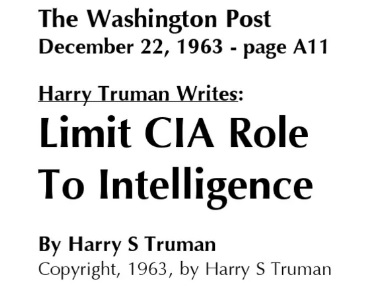 By 1963, Truman admitted in writing that he was seriously “disturbed by the way CIA has been diverted from its original assignment.”