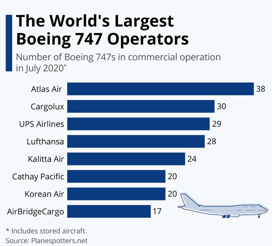Cargolux and UPS Airlines, two more aerial freight specialists, come second and third on the 747-operator list with 30 and 29 in service, respectively.