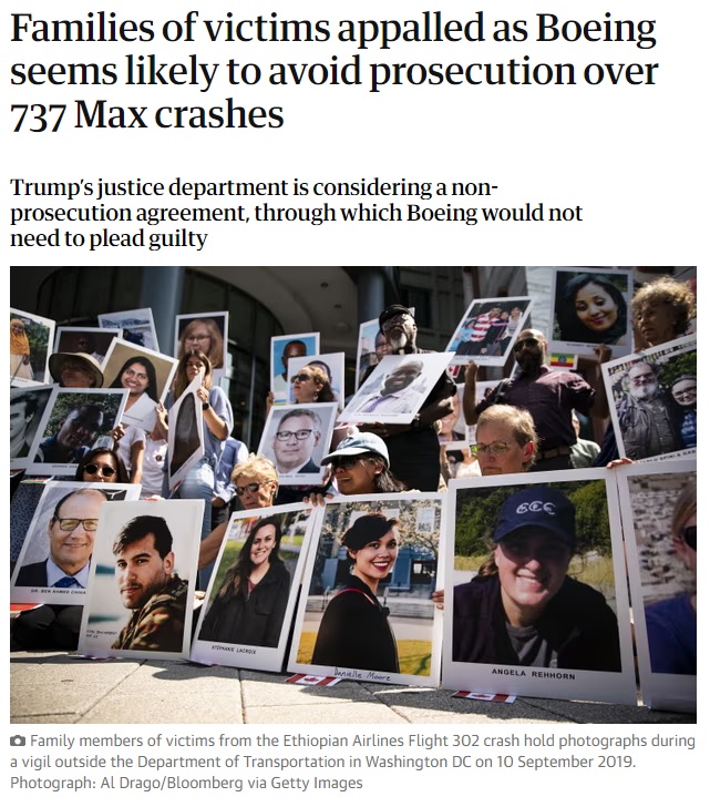 The U.S. Department of Justice is considering a non-prosecution agreement that would allow Boeing to dodge a guilty plea. The families of crash victims, however, have voiced outrage, condemning the tentative deal as “morally repugnant.”